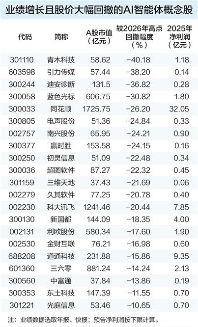 据数据宝统计,从股价表现来看,截至3月10日,上述业绩增长的28只AI智能体概念股中,最新收盘价较2026年以来高点回撤20%以上的有13只。青木科技、引力传媒、迪安诊断、蓝色光标、同花顺等回撤幅度靠前。